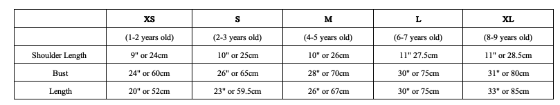 Model's Measurement :Β Bust: 25inch/ 63cm ; Waist: 22inch/ 56cm ; Hips: 27inch / 68cm ; Neck: 10.5 inch/ 27cm ; Shoulder: 13.5inch/ 35cm ; Height: 129cm ; Weight: 25kg (Model is 8 years old, wearing L size)