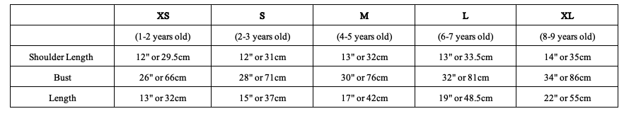Model's Measurement : Bust: 24inch/ 61cm ; Waist: 22.5inch / 57cm ; Hips: 26inch/ 66cm ; Neck: 11.5inch/ 29cm ; Shoulder: 13inch/ 34cm ; Height: 118cm ; Weight: 22.40kg (Model is 6 years old, wearing size L)