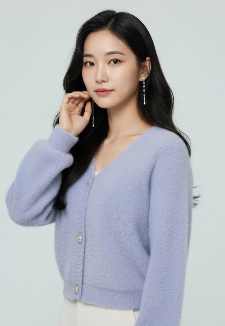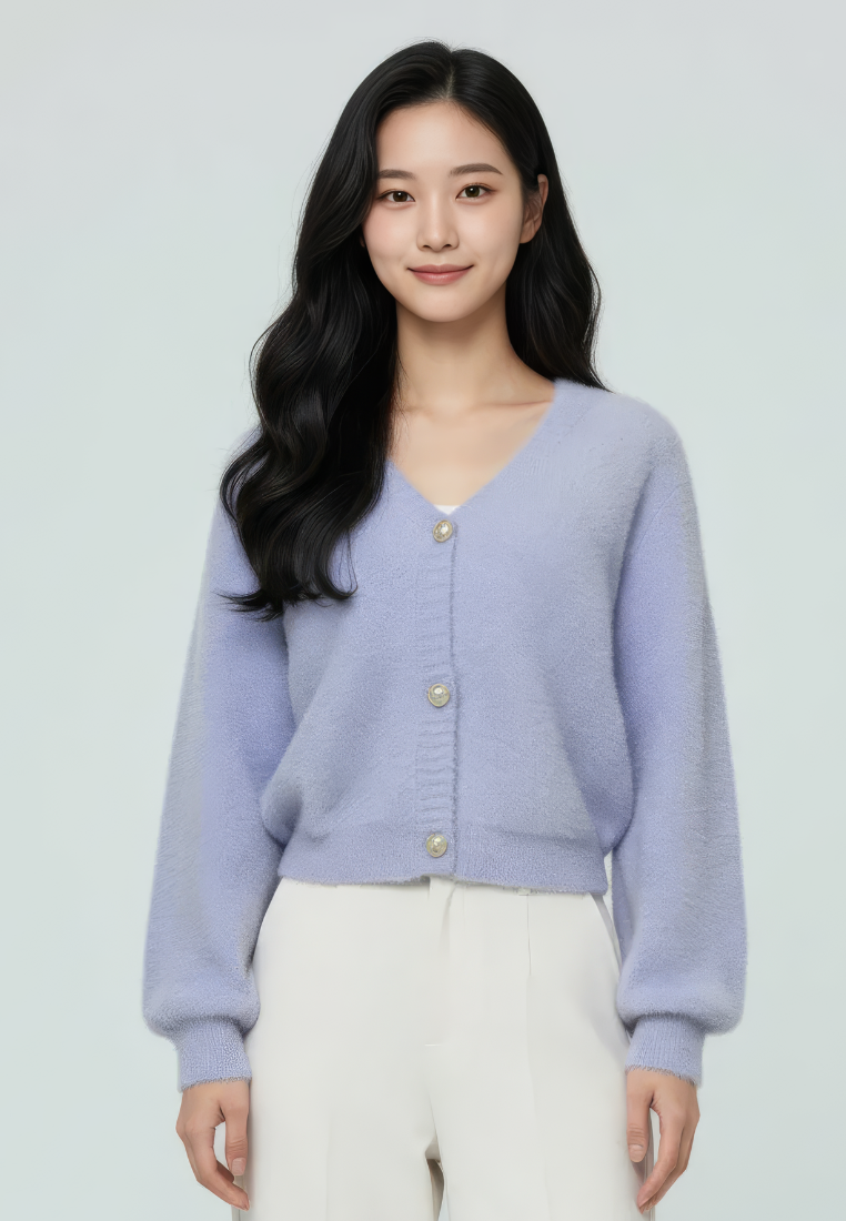 Delora Fuzzy Cardigan With Heart Pearl Buttons (Purple)